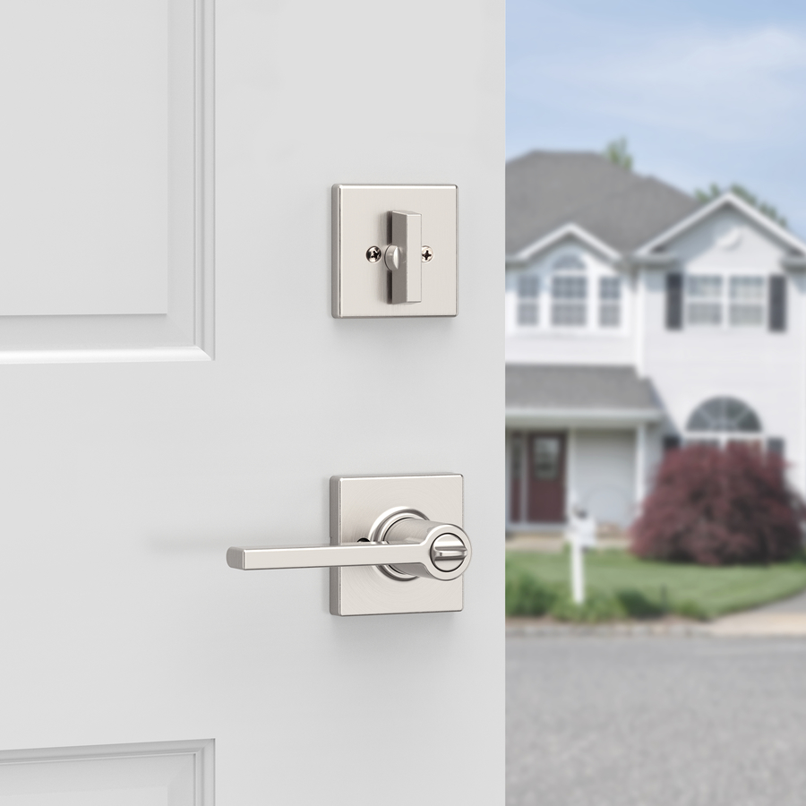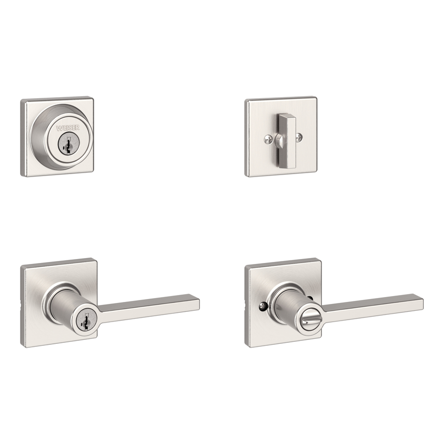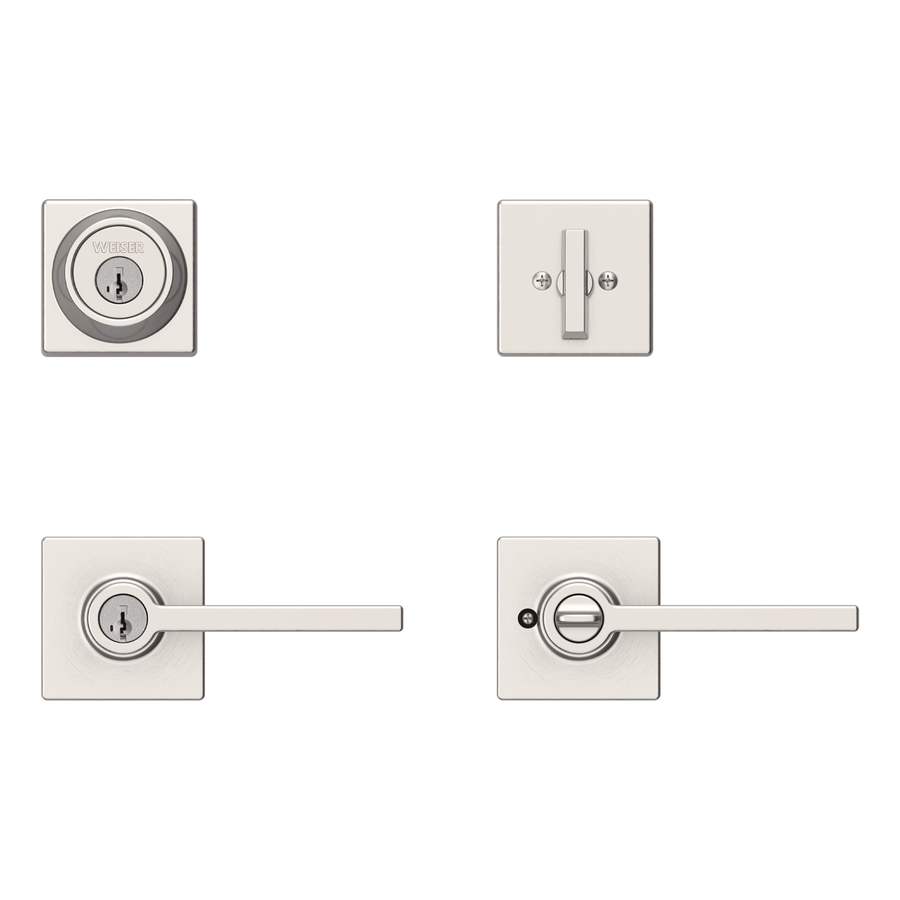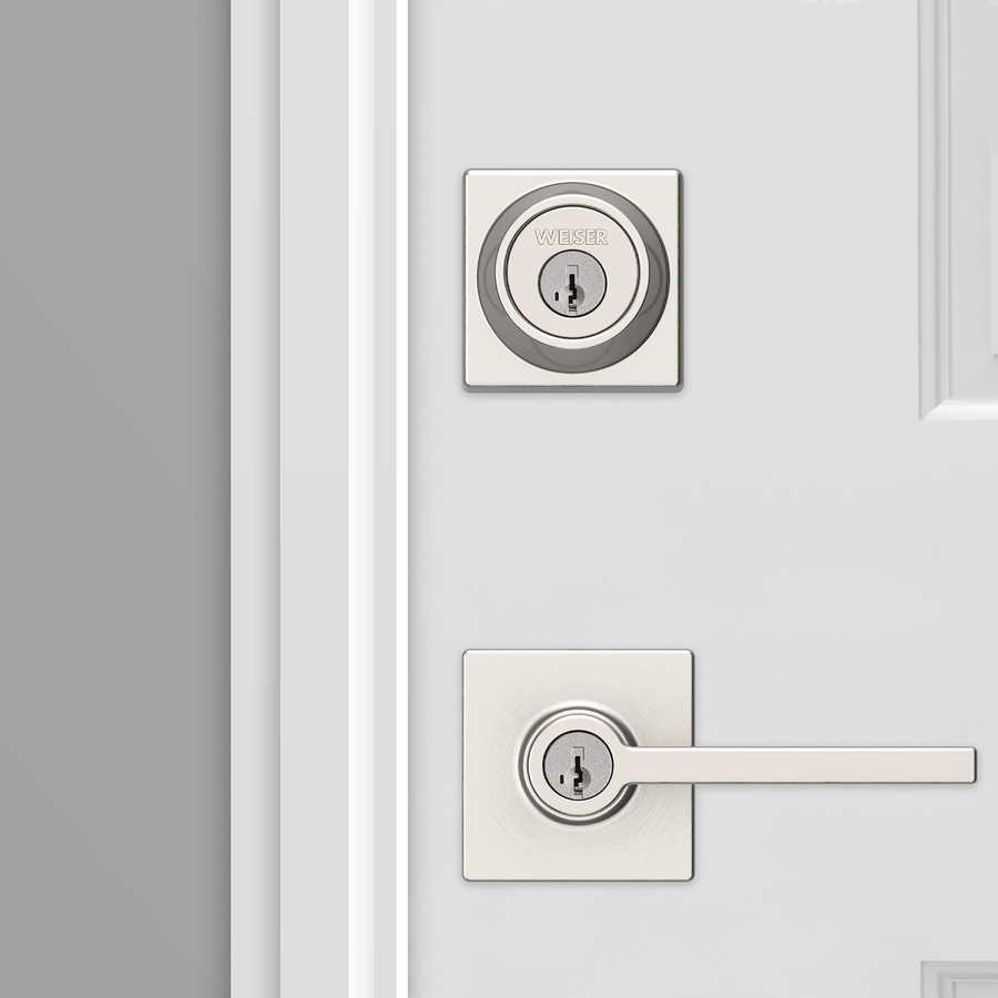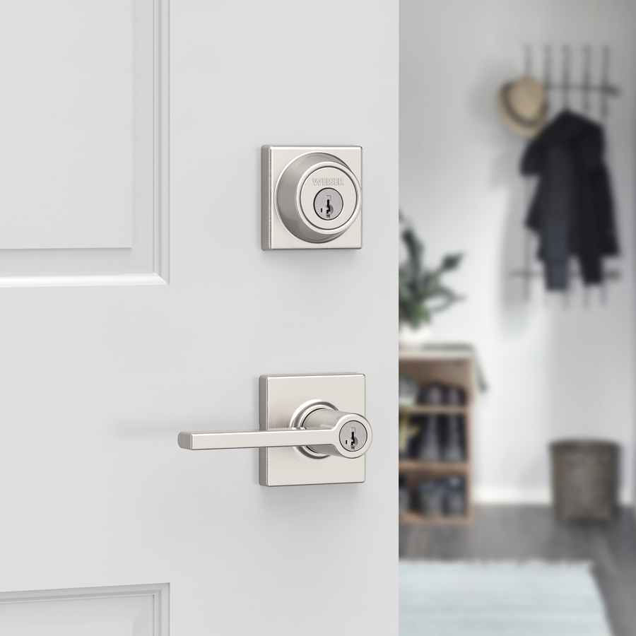 The satin nickel Casey entry handleset by Weiser combines durability with stylish design. Featuring SmartKey Security, it is protected against advanced break-in techniques and allows you to re-key your lock yourself in seconds. This lever has a Microban Antimicrobial product protection that keeps door hardware 99.9% cleaner than unprotected surfaces. This combo pack provides two locking points, keyed entry and a keyed deadbolt. It has an adjustable backset 2 3/8-in to 2 3/4-in to fit all standard door preparations. The fully reversible lever can be installed on both right handed and left handed doors. It comes with 4 keys and the latches have 2 interchangeable faceplates : round corner and square corner. This product is covered by a lifetime limited warranty.