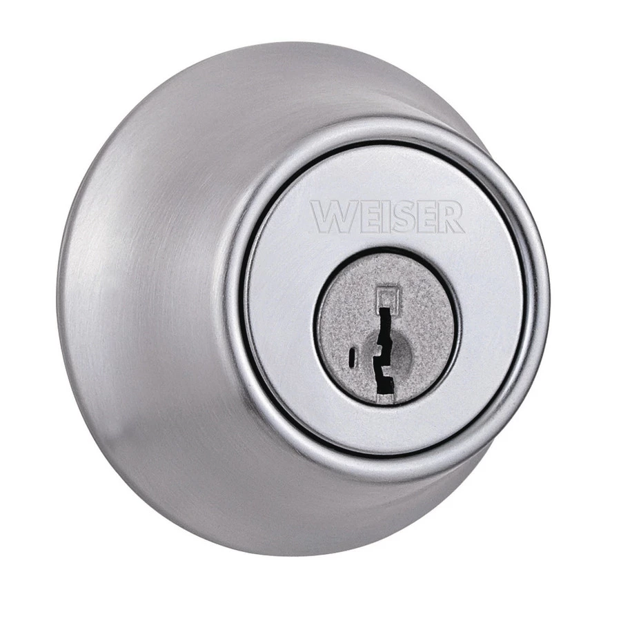 Keep your home secure by placing this Weiser single cylinder deadbolt on any entry door. It features a 1″ throw that works with any standard door preparation and is easy to install with minimal tools. Re-key this brass Weiser deadbolt as needed in just a few steps with SmartKey technology. It also includes a pair of keys and has a satin chrome finish. The element series latch is adjustable, 2 3/8″ and 2 3/4″ and fits doors with a thickness of 1 3/8″ to 1 3/4″.