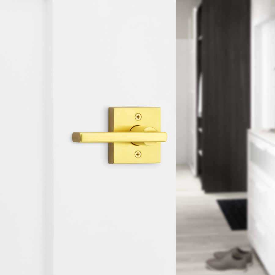 Add style without sacrificing function and security with Weiser. This privacy lever is best used in interior bedroom and bathroom applications where privacy is required. Both levers are operated by the push button on the inside. The outside lever is unlocked by an emergency key. The textured finish of Satin Brass gives it a refined, rustic look.