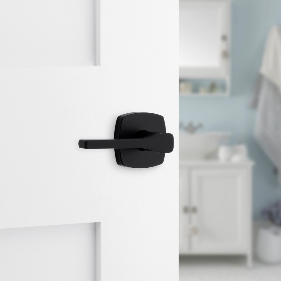 Add style without sacrificing function and security with Weiser. This privacy lever is best used in interior bedroom and bathroom applications where privacy is required. Both levers are operated by the thumb turn on the inside. The outside lever is unlocked by an emergency key. The rich tones of Matte Black add the finishing touch to this product. The Matte Black finish provides a rich and warm complement to the product/s style.