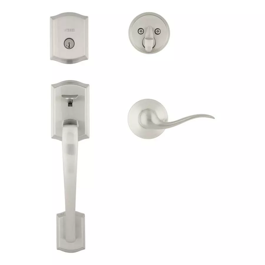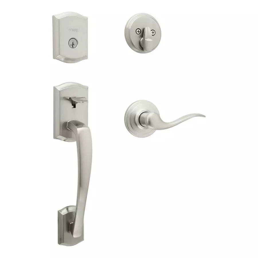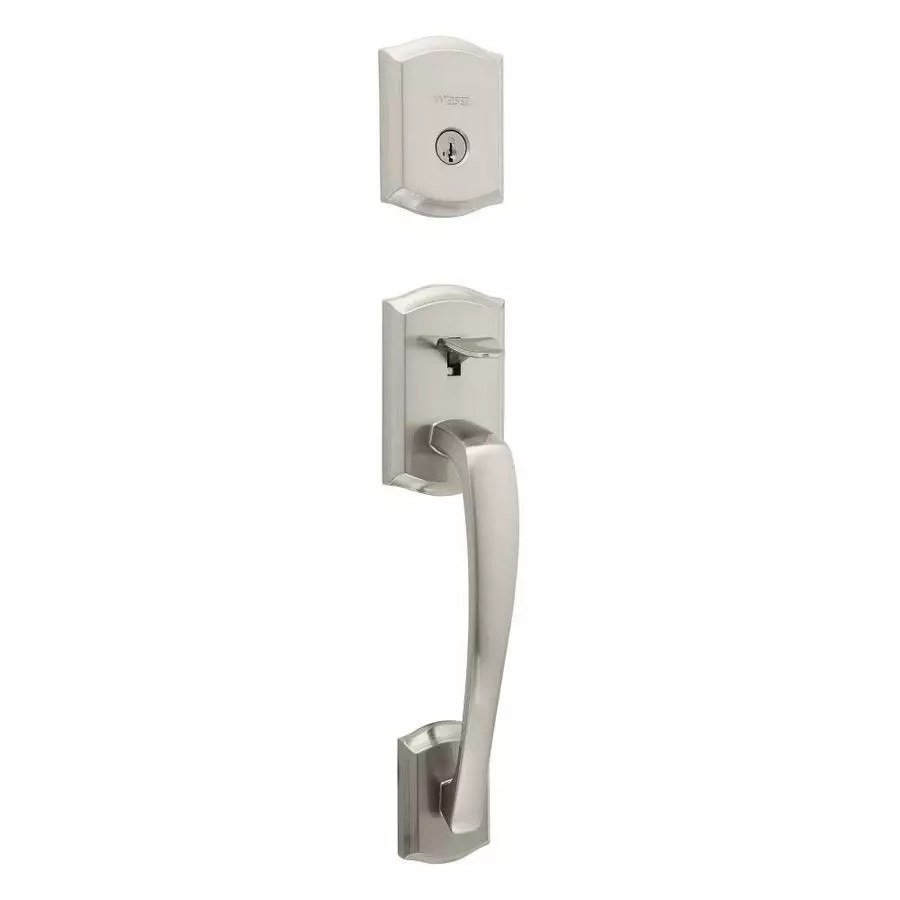 Weiser proposes the satin nickel Prescott handle set offering safety without compromising style and elegance. Featuring SmartKey security, which protects against advanced break-in techniques and allows you to rekey your lock yourself in seconds. This technology is compatible with Kwikset (KW1) keyway. The latch has 2 interchangeable faceplates, round or square corners while the latch has an adjustable backset of 2.37-in and 2.75-in allowing it to fit all standard door preparations. The locking mechanism functions with a turn piece on the interior of the lock. This handle is easily installed with just a screwdriver.