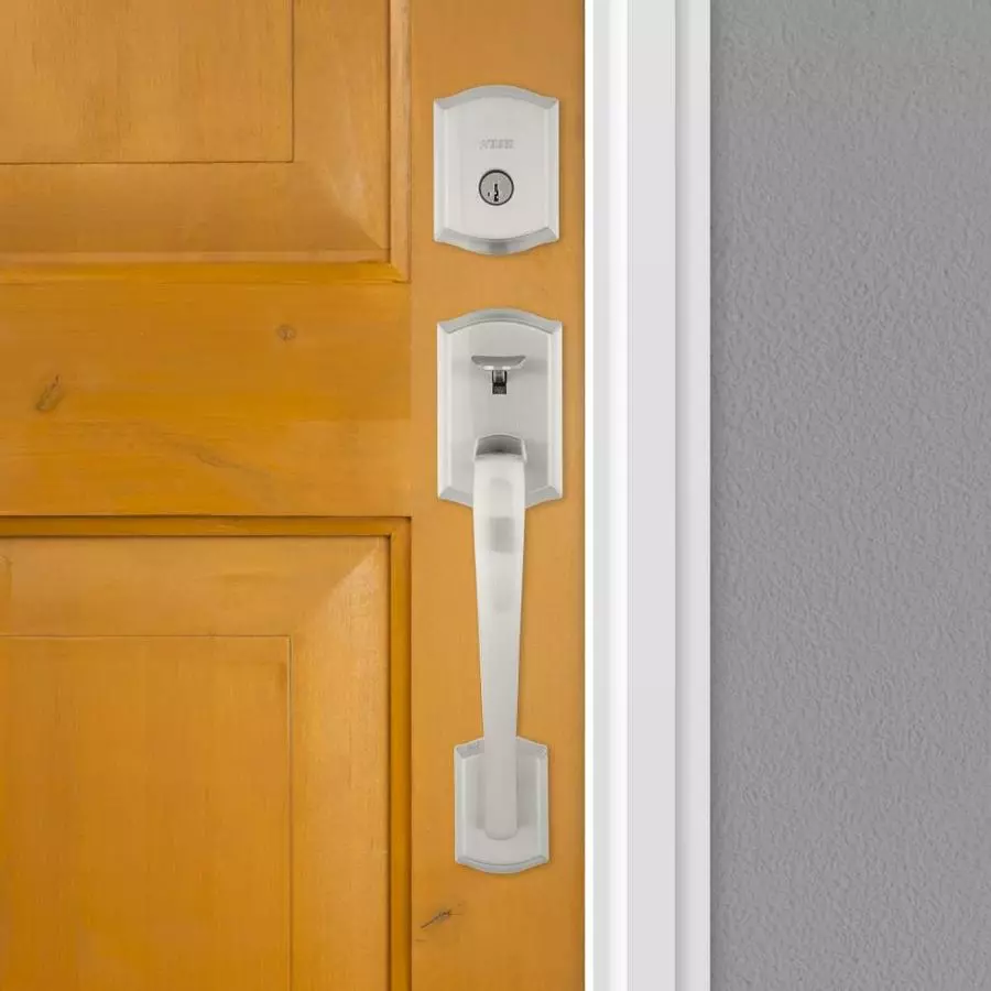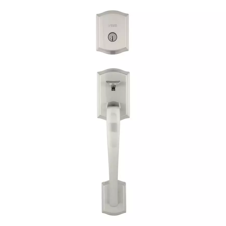Be the first to review “Weiser Prescott Single Cylinder Handleset With Toluca Lever Featuring SmartKey Security In Satin Nickel” Cancel reply